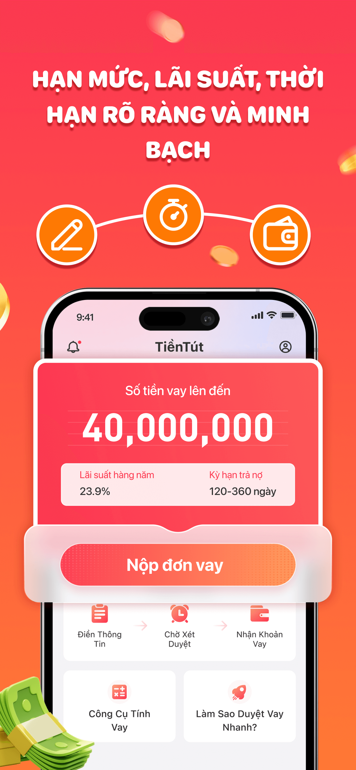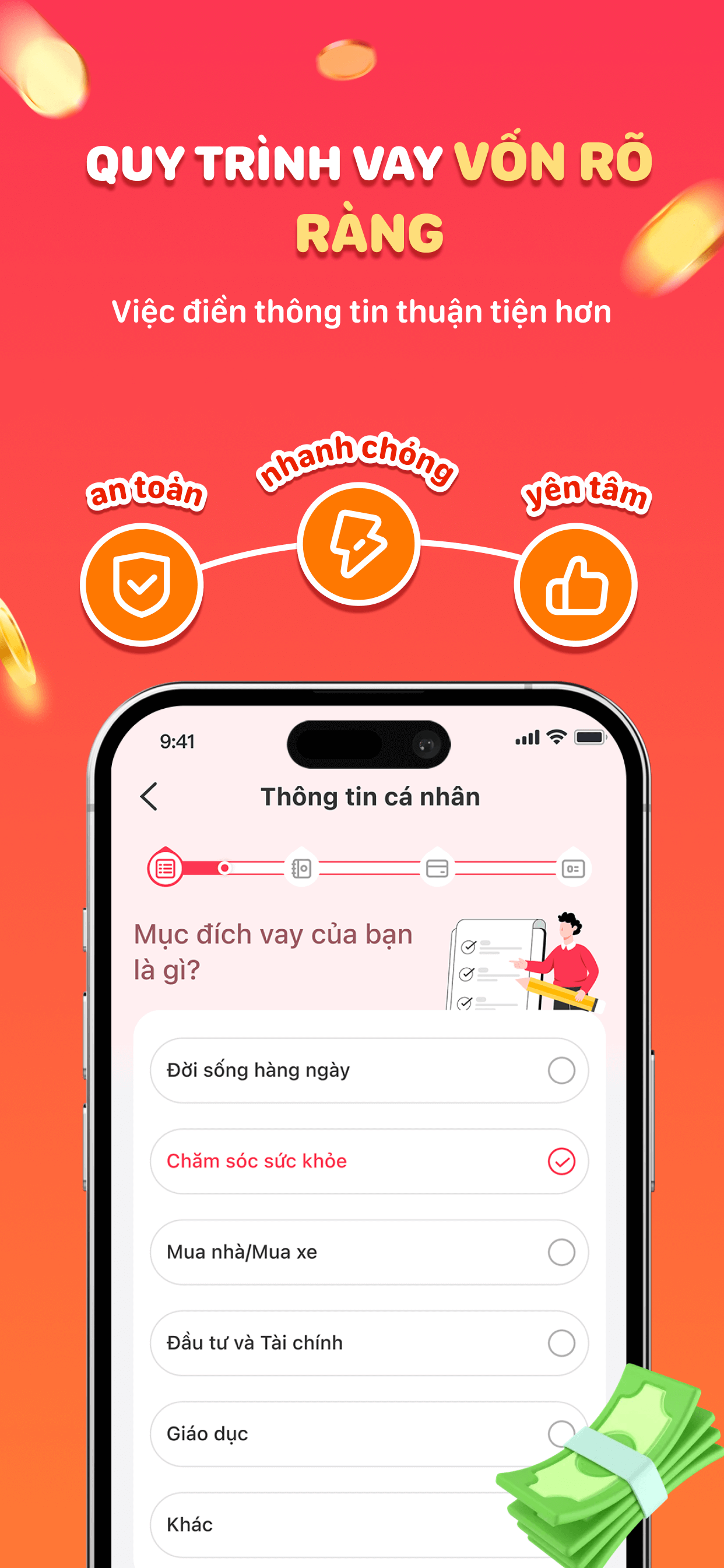 Dù là tiêu dùng cá nhân, đầu tư giáo dục, vốn khởi nghiệp hay nhà ở gia đình, chúng tôi đều cung cấp cho bạn sự hỗ trợ tài chính đáng tin cậy với quy trình minh bạch, lãi suất hợp lý và dịch vụ chuyên nghiệp.