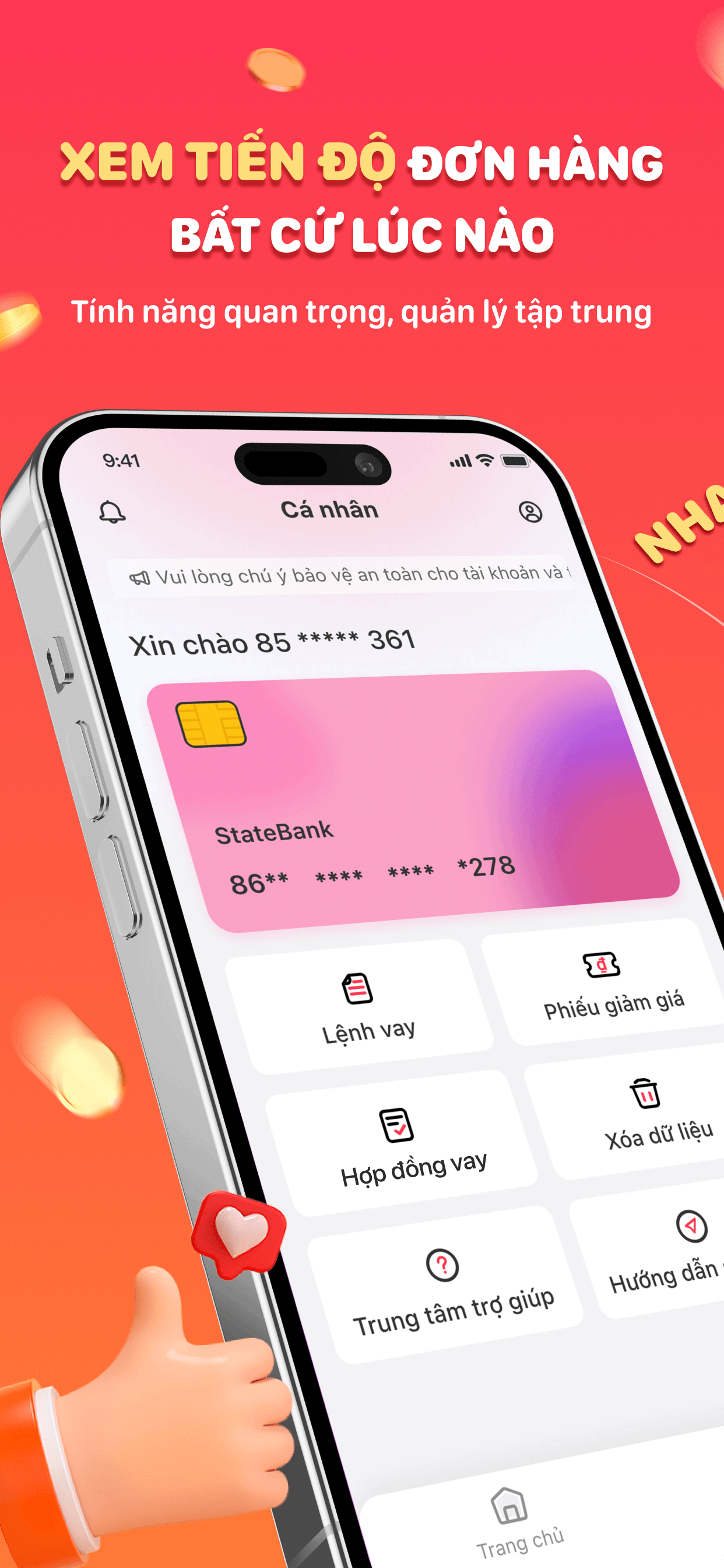 Nhắc lịch thanh toán đúng hạn, tra cứu hợp đồng và lịch sử giao dịch; hỗ trợ chăm sóc khách hàng khi bạn cần.